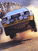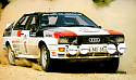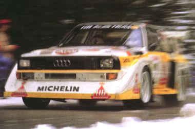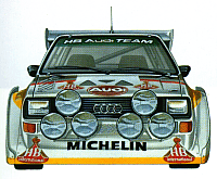 Double world championship. This year the Audi Quattro (the short version) has been unbeatable. Many victories were reached. Walter Röhrl was one of the drivers who could make this possible. The horse power reached the spectacular number of 400. Undependent test engineers measured for the Audi Quattro Sport version accellerations of less then 3 seconds for reaching a speed from 0-100 km/h. These specs are close to formula 1. | ![]() |